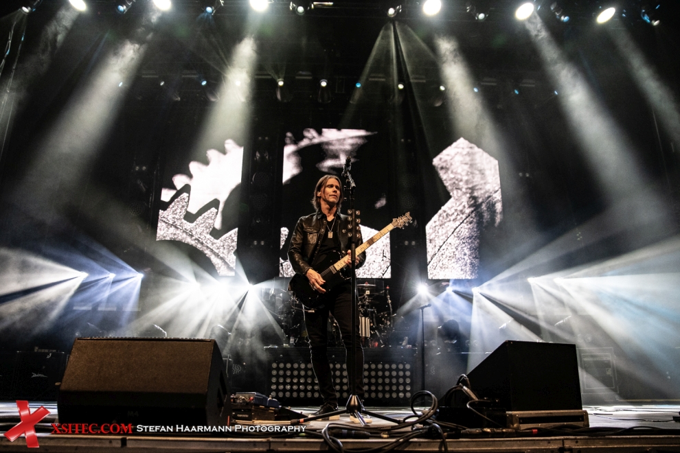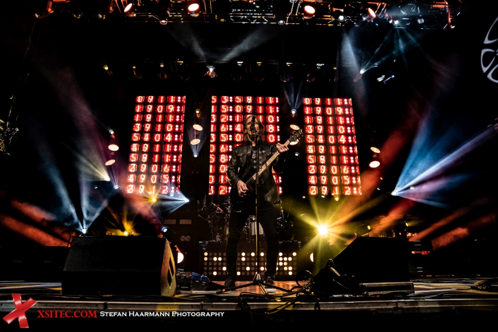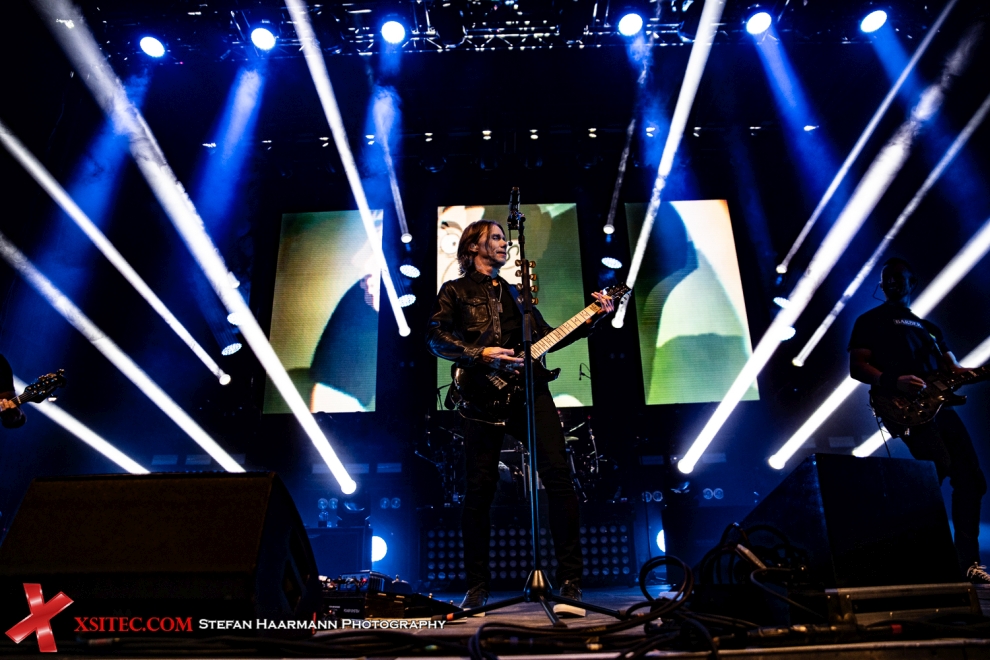 Waren die LED Walls im Hintergrund während der Shows von MAMMOTH WVH und HALESTORM lediglich zur Projektion des jeweiligen Bandlogos im Einsatz, entfalten sie nun ihr volles Potential und liefern die visuelle Unterstützung der ALTER BRIDGE Show. Mal werden hier Cartoon-Szenen eingespielt, mal Zahlenkolonnen, die „Ghost Of Days Gone By“ visualisieren. „Silver Tongue“ vom aktuellen Album eröffnet den Reigen ihrer Werkschau, die einen komplettes Bild des bisherigen Schaffens der Band darstellt. Hier sei angemerkt, dass sich die neuen Songs perfekt in das bisherige Portfolio der Band einreihen, das von radiotauglichen Nummern bis hin zu metallischen Hartkeksen reicht.