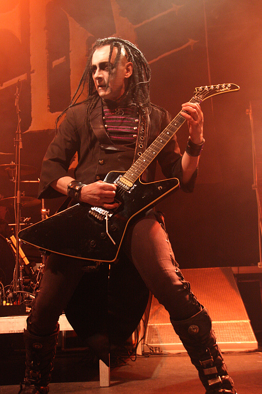 Kurz vor 19.30 Uhr erklingt RAINBOWs "Long Live Rock 'n' Roll" in der Halle und gibt den Startschuss, wenige Augenblicke später erscheinen HELL auf der Bühne. Und zünden von der ersten Sekunde an ein Feuerwerk theatralischen Heavy Metals. Links und rechts auf der Bühne stehen Aufsteller mit beleuchteten Kirchenfenstern, die aber überaus unfromme Darstellungen zeigen. Eine gigantische Kanzel steht ganz links und wird im Verlaufe der Show auch zum Einsatz kommen. Die Mitglieder der Band, die ihre Anfänge zu Beginn der 80er hatte, sind fahl geschminkt und wirken, als kämen sie direkt aus Madame Tussauds Wachsfigurenkabinett, sind dafür aber enorm beweglich. Relativ unscheinbar auf der linken Bühnenseite bearbeitet Initiator Andy Sneap sein Instrument, optisch machen die beiden anderen Saiteninstrumentalisten einiges mehr her. Basser Tony Speakman sieht man am deutlichsten an, dass er nicht mehr der Jüngste ist, sein tief gefurchtes Gesicht sorgt in Kombination mit dem schütteren Haar für ein skurril-gespenstisches Gesamtbild. Mit seinen langen Dreads könnte Gitarrist Kev Bower dagegen auch bei den NINE INCH NAILS oder bei MARILYN MANSON mit auf der Bühne stehen, ohne negativ aufzufallen.
