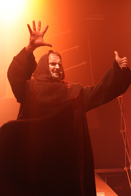 Das optische Hauptaugenmerk liegt aber auf Sänger David Bower, dem man deutlich anmerkt, dass er aus dem Theater kommt. Mit Stacheldraht-Krone auf dem Kopf, blutroten Kontaktlinsen in den Augen und Headset-Mikrofon stürmt er auf die Bühne und beeindruckt nicht nur mit einem außergewöhnlichen Gesang, sondern auch mit seiner lebendigen Performance, bei der er auch immer wieder mit dem Publikum interagiert. Es ist wirklich ein Hochgenuss, wie er mit Gesten und Mimik die Songs interpretiert. Zu "Plague And Fyre" kommt er mit Mönchskutte und schauriger Vogelskelett-Maske auf die Bühne, bei "Blasphemy And The Master" geißelt er seinen nackten Oberkörper mit einer Peitsche. Oder er springt in den Fotograben und legt den Zuschauern in der ersten Reihe die Hände auf, um eine Dämonenaustreibung vorzunehmen. Natürlich merkt man zu jeder Sekunde, dass das nichts anderes als großes, shakespearianisches Theater sein soll, das jedoch ist auch ganz großartige Unterhaltung. In den 45 Minuten, die HELL zur Verfügung stehen, kommen natürlich nur Songs des einzigen Album "Human Remains" zum Zug, die werden von der Band bei gutem Sound (bei dem es nur anfangs leichte Schwierigkeiten gibt) souverän gespielt. Zu einem perfekten Auftritt fehlen nur noch die Höllenfeuer-Pyros, aber die gibt es für eine Vorband natürlich nicht.
