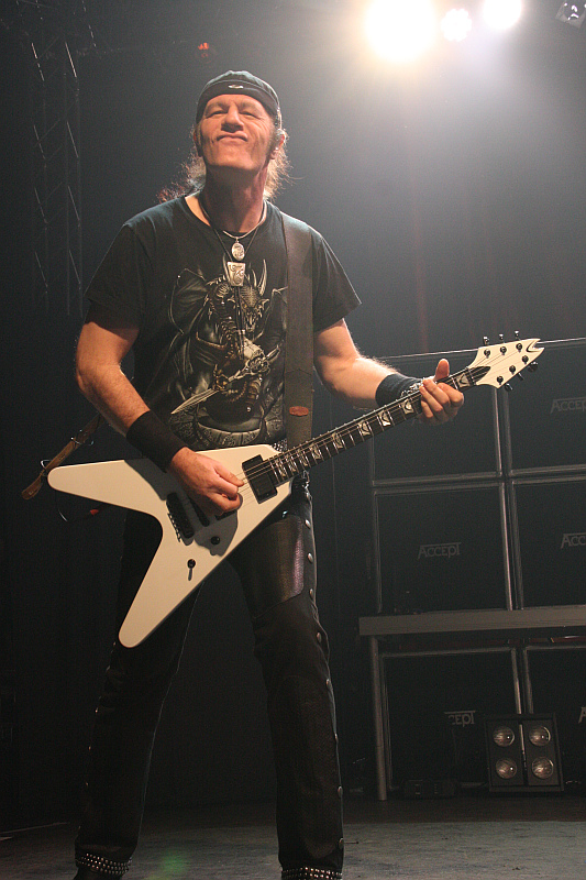 Nach dem "Heaven And Hell"-Intro geht es - etwas überraschend - nicht mit "Hung, Drawn And Quartered", dem Opener des aktuellen Albums los, sondern mit "Hellfire", bei dem die Bühne passend in rotes Licht getaucht ist. Und sofort wird klar, was einen in den nächsten zwei Stunden erwartet. Ein Wolf Hoffmann an der Gitarre, der entweder wie ein Honigkuchenpferd grinst, Grimassen schneidet oder die typischen Posen mit Basser Peter Baltes zur Schau stellt. Die beiden sind die Aktivposten auf der Bühne. Der zweite Gitarrist Herman Frank erledigt seine Aufgabe etwas zurückhaltender, aber ebenfalls mit viel Spielfreude. Alle drei sind für charakteristischen Backing Vocals zuständig, die direkt im folgenden "Stalingrad" zum Zuge kommen. Sänger Mark Tornillo schwenkt in dem Song auch eine ACCEPT-Flagge, was ein bisschen übertrieben pathetisch wirkt, aber sei es drum. Das gehört bei ACCEPT eben auch dazu. Mit "Restless And Wild" folgt der erste Klassiker von 1982, vom gleichen Album folgen noch "Neon Nights", natürlich "Princess Of The Dawn" (mit gutem Bass-Solo) sowie als letzter Song des Hauptteils das famose "Fast As A Shark". Überhaupt ist die 21 Songs starke Setlist extrem 80er-lastig. Von "Breaker" (1981) gibt es den Titeltrack und "Son Of A Bitch", von "Balls To The Wall" (1983) natürlich den Titeltrack als allerletzten Song sowie "Losers And Winners" und von "Metal Heart" (1985) drei Songs: "Up To The Limit", "Living For Tonite" sowie den Titeltrack als erste Zugabe. Dazu wird der Löwenkopf, der früher das Logo zierte, hinter den Drums in die Höhe gehievt und leuchtet rot aus den Augen. Mit "Monsterman" und "Aiming High" vom "Russian Roulette"-Album von 1986 gibt es weitere Songs, die man nicht unbedingt auf der Rechnung hatte, zu hören. Ein einziger Song aus den 90ern wird gespielt, nämlich "Bulletproof" von der "Objection Overruled", bei dem sich Baltes und Hoffmann ein cooles Duell Bass Vs. Gitarre liefern. Auch bei solchen Aktionen spielen ACCEPT ihre Erfahrung voll aus, es wird nie übertrieben in die Länge gezogen (gleiches gilt für die Mitsingspielchen bei den üblichen Verdächtigen), darf aber auch nicht fehlen. Seinen großen Einzelmoment hat Hoffmann nach "Shadow Soldiers" vom neuen Album, das jetzt schon als Liveklassiker gesehen werden darf. Fehlen nur noch die Songs vom Comebackalbum "Blood Of The Nations", davon werden - auch etwas überraschend - "Pandemic", "No Shelter", "Bucketful Of Hate" und natürlich "Teutonic Terror" als zweite Zugabe gespielt.