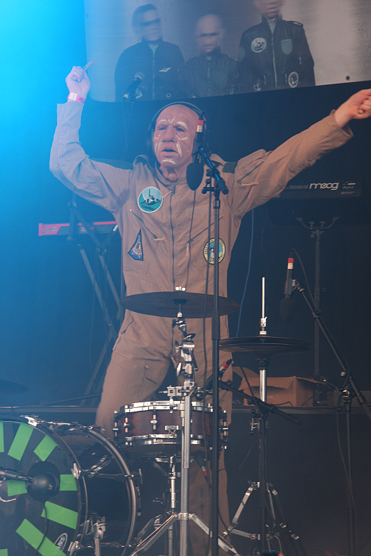 Amphi Festival 2011SALTATIO MORTIS auf der Mainstage werden nur im Vorbeigehen kurz belauscht, denn es gilt, zeitig wieder im Staatenhaus zu sein. Dort steht mit FEINDFLUG die Band auf dem Programm, die bei der letzten Show auf dem Amphi mit ihren Bässen dafür sorgte, dass der Putz im Staatenhaus von den Wänden fiel, woraufhin die Location aus Sicherheitsgründen geschlossen wurde. In diesem Jahr bleibt zum Glück alles intakt, als das Kollektiv sein Inferno aus Stroboskop-Blitzen, brachialen Rhythmen und Percussions und wilder Thrash-Gitarre entfacht. Zwar hört sich jeder der zehn gespielten Songs (darunter "AK 47", "Truppenschau", "Roter Schnee" und "Stukas im Visier") irgendwie gleich an, aufgrund der hypnotischen Wirkung der Kombination aus Licht und Sound ist der Auftritt trotzdem beeindruckend. Das militaristische Auftreten muss man zwar nicht zwingend gut finden, doch passt es ins perfekt Konzept, das an diesem Nachmittag die Massen anzieht. Das Staatenhaus ist bis auf die allerletzte Ecke gefüllt und sinnvollerweise wird niemand mehr ins Gebäude gelassen. So warten einige hundert Zuschauer vergeblich vor geschlossenen Toren auf Einlass.