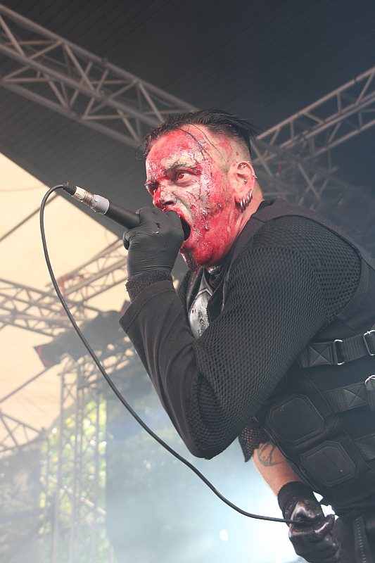 Amphi Festival 2011Danach ist Zeit für DIE LOKALMATADORE. Wie bitte? Zumindest läuft deren markante Liedzeile "Pillemann Fotze Arsch" in Dauerschleife als Pausenmusik vor dem Auftritt von AGONOIZE - nicht unbedingt unpassend. Die Bühne ist übrigens komplett mit weißem Tuch abgehangen. Die Ansage der Band übernimmt Alexx Wesselsky, der dieses Jahr mal nicht mit EISBRECHER auftritt, sondern nur trinkender Gast ist und die eine oder andere Ansage übernimmt. Die anwesenden Eltern werden gebeten, ihren Kindern Ohren und Augen zu zu halten - aus gutem Grund. Gleich zwei mal erklingt der "Imperial March" aus Star Wars als Intro, dann aber fällt endlich der Vorhang und Sänger Chris L. hängt in eine Zwangsjacke gekleidet an zwei Schnüren unter der Bühnendecke und intoniert so den Opener  "Open The Gate". Dann wird er von zwei Mönchen herab gelassen, ein Meuchelmörder mit Ledermaske kommt auf die Bühne und schneidet ihm die Haut vom Gesicht - zumindest soll man den Eindruck bekommen. Fortan rennt Chris mit entsprechend gerötetem Gesicht über die Bühne. Und sonst? Wenn man AGONOIZE schon zwei Mal live gesehen hat, hauen sie einen beim dritten Mal irgendwie nicht mehr vom Hocker. Das Aggro-Gepose, die Kunstblutfontänen ins Publikum, der pumpende, aber nicht sonderlich außergewöhnliche Aggrotech-Sound - alles ganz nett soweit, aber der Reiz ist inzwischen flöten gegangen. Da im Staatenhaus zudem DAS ICH anstehen, wird der Auftritt nicht zu Ende geguckt, aber dem Wochenend-Trend folgend spielen AGONOIZE ihren größten Hit "Koprolalie" nicht, sondern kredenzen als Zugabe ein Coverversion des KISS-Klassikers (!) "I Was Made For Lovin' You".