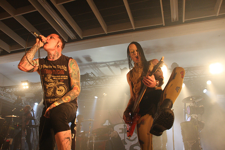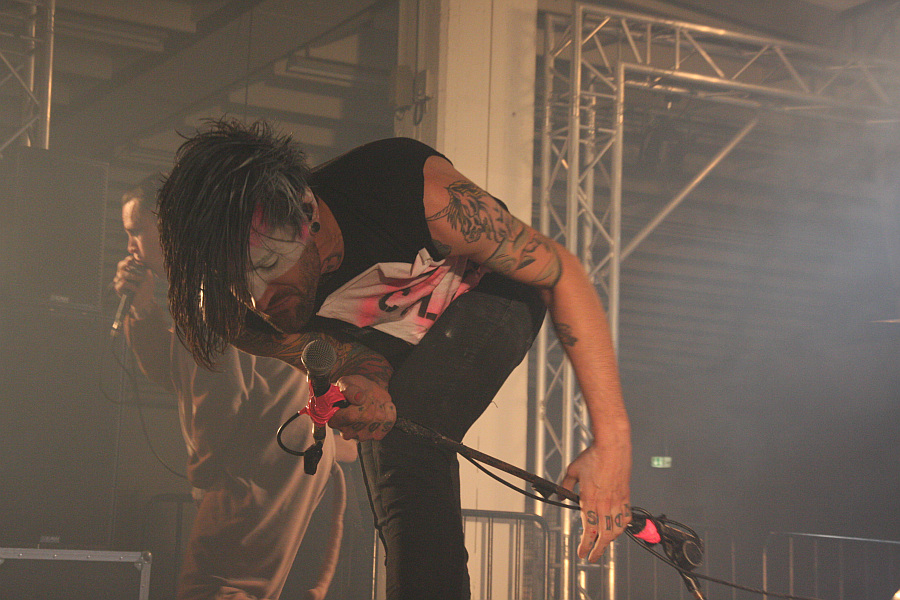 Denn auch im weiteren Verlauf hat Joe Letz sichtbaren Spaß daran, seine Trommeln immer wieder über die Bühne zu werfen und immer wieder rennt der Roadie hin und stellt sie wieder auf, dabei immer darauf achtend, nicht von irgendeinem anderen Teil getroffen zu werden. Inzwischen haben COMBICHRIST auf der Bühne auch einen Gitarristen dabei, der dem Sound eine noch rockigere Note verleiht, zudem passt er mit seiner MARILYN MANSON-Optik auch bestens zu den Chaoten. Die haben sich inzwischen aus ihren Kostümen befreit, das Energielevel des Auftritts bleibt aber superhoch. Nach "Blut Royale" gibt es tempomäßig eine erste leichte Verschnaufpause mit "Deathbed", bevor dem Publikum wieder alles abverlangt wird, denn es folgen "Get Your Body Beat", "Electrohead", "Shut Up And Swallow" und "Fuck That Shit", bei dem die Leute dazu aufgefordert werden, alle Mittelfinger in die Höhe zu recken. Ein schönes Bild. Sowohl musikalisch, als auch vom Energielevel her sind COMBICHRIST die Rock'n'Roll-Band des Electrogenres schlechthin, liebenswerte Wahnsinnige, die auf der Bühne ihren Heidenspaß haben und das Publikum dementsprechend mitreißen. Nach 13 Songs ist dann Schluss und COMBICHRIST stehen klar als Gewinner des Festivals fest. Geile Show, ohne wenn und aber.