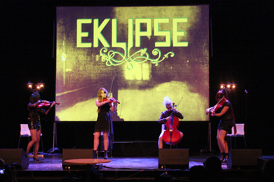 Angesichts der deftigen Sonneneinstrahlung ist ein Besuch im Theater des Tanzbrunnens eine willkommene Abwechslung. Dort stehen die vier Damen von EKLIPSE auf der Bühne. Damen? Bei genauerem Hinsehen stellt man fest, dass die Streicherinnen aus Russland offenbar jünger sind, als die heißen Promofotos vermuten ließen. Russland? Dafür ist die Ansage auf Deutsch von einer der vier Mädels aber ganz schön akzentfrei... nun ja, ich hatte von Anfang an die Vermutung, dass das Marketing von EKLIPSE es mit der Wahrheit eher semigenau nimmt und das scheint sich zu bewahrheiten.