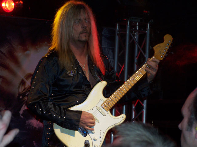 mitreißend und ausgiebig runterzockt und ein Highlight der Show liefert. Selbst Axel kommt dabei mal etwas stärker aus sich raus und betätigt sich zwischenzeitlich als Faust schwingender Motivator. Ansonsten zeigt er sich wie üblich nicht nur recht bewegungsarm, sondern auch gewohnt stumm und zurückhaltend und man hat ja oftmals den Eindruck, ihm sei gerade eine Laus über die Leber gelaufen. Seine Gefühle offenbart er halt lieber mittels seiner weißen Fender, wie etwa verschärft bei "The Temple Of The King", bei dem er mal vollständig seinen Einflüssen frei Lauf lässt.