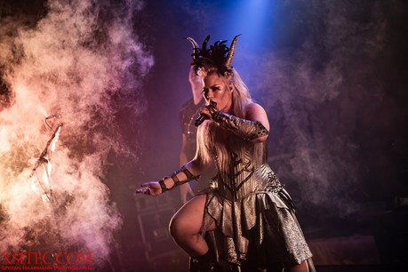 BATTLE BEAST haben sich ihrerseits auch nicht lumpen lassen und eigenes Bühnenlicht mit nach Bochum gebracht. Zusätzlich stehen auf der Bühne farbig illuminierte Nebelfontänen, die der Show zusätzliche Effekte verleihen. Noora Louhimo glänzt mit eindrucksvollem Gesang, der druckvoll und voller stimmlicher Facetten ist. Die Frontlady scheut sich auch nicht, die teilweise schwindelerregenden Tonhöhen, bei der viele ihrer Kolleginnen schlicht passen müssten, auch „Live“ auf die Bühne der Zeche zu bringen.