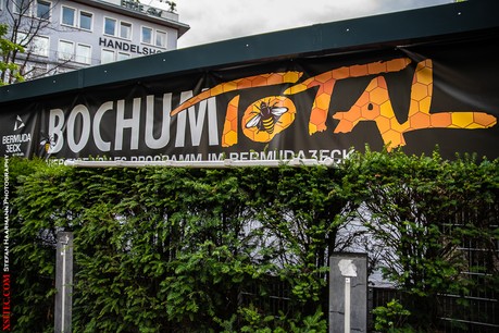 Der Finaltag des diesjährigen „Umsonst und Draußen“-Events BOCHUM TOTAL zeigt sich zwar etwas kühler als an den drei vorangegangenen, sehr heißen Tagen, macht aber den kräftigen Regen, der Samstagabend während der BETONTOD-Show niederging, vergessen. Hier und da erinnern noch ein paar Pfützen an die Niederschläge der vergangenen Nacht, aber auch der ein oder andere Besucher macht den Eindruck, als hätte er im Laufe einer langen Aftershow-Party mehr als nur einen Absacker hinnehmen müssen.