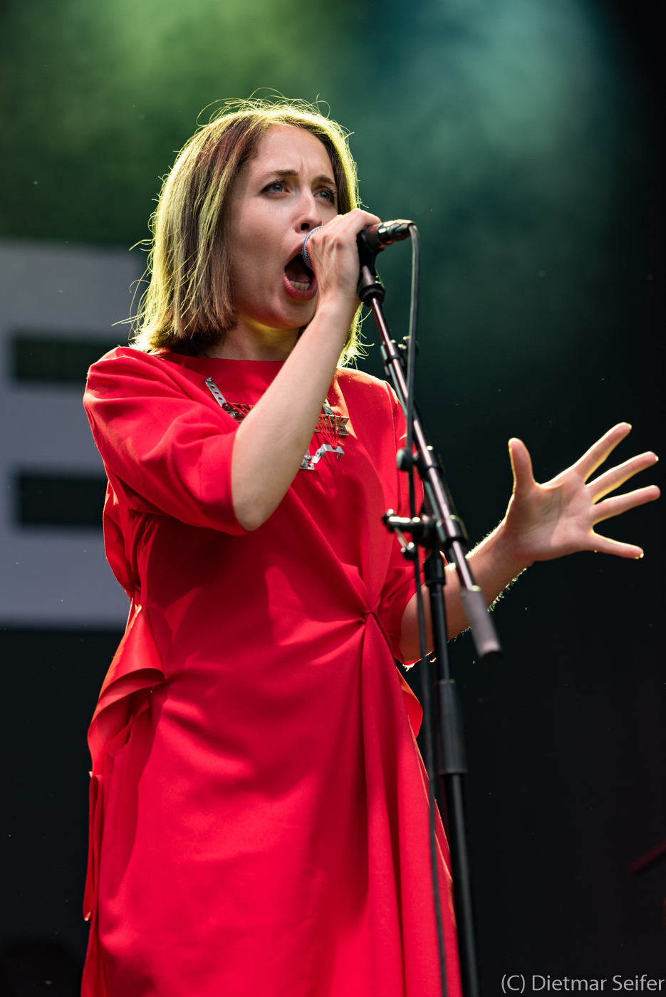 Headliner am Donnerstag, meinem ersten Tag, war sicher die deutsch-britische Popmusikerin Alice Merton, die aktuell mit „No Roots“ unter den ersten 30 in den deutschen TOP 100 Charts vertreten ist. In einem selbstdesignten und hochgeschlitzten roten Kleid, mit einer großen ebenfalls roten Schleife auf dem Rücken und einer vorne angenähten Metallapplikation, die stark an meine frühen Versuche mit Fischer Technik erinnerten, fiel sie neben ihren dunkel gekleideten Bandmitgliedern nicht nur durch Ihre Stimme auf. Nein, sie hat auch, im Gegensatz zu anderen Künstlern, den Soundcheck selber durchgeführt.