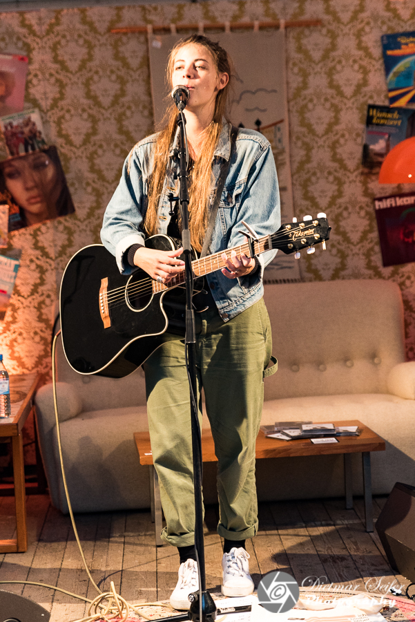 Da ich noch etwas Zeit hatte, bin ich an einer Special-Location vorbeigegangen, der „Wohnzimmerbühne Harmoniestraße“. Dort spielte gerade „Fee.“. Es sind melancholische und eigenwillige, tiefe und schöne Lieder, die die junge Singer-Songwriterin aus Frankfurt am Main schreibt. Nonchalant und direkt erzählt sie in ihren Liedern von der Suche nach dem richtigen Platz im Leben, nach Haltungen zur Welt, von Liebe und Selbstbehauptung. Momentaufnahmen nennt sie ihre Texte. „Ein Foto ist ein Foto. Auch wenn man sich nachher wünscht, man hätte darauf gelächelt.“