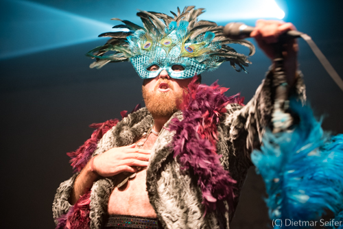 Das Bühnenoutfit des in Kanada geborenen Norwegers, der in Deutschland aufgewachsen ist, war schon sehr skuril. Geschmückt mit einer venezianischen Karnevalsmaske, die mit Pfauenfedern verziert war sowie Federboa und Bauchbinde, wirkte er wie ein Überbleibsel aus Casanovas Zeiten, wogegen er sich jedoch mit seiner Musik erfolgreich zu wehren wusste. Aber auch seine Bandkollegen waren mit einer grünen Gesichtsbemalung versehen und mit Panzerband verklebt.