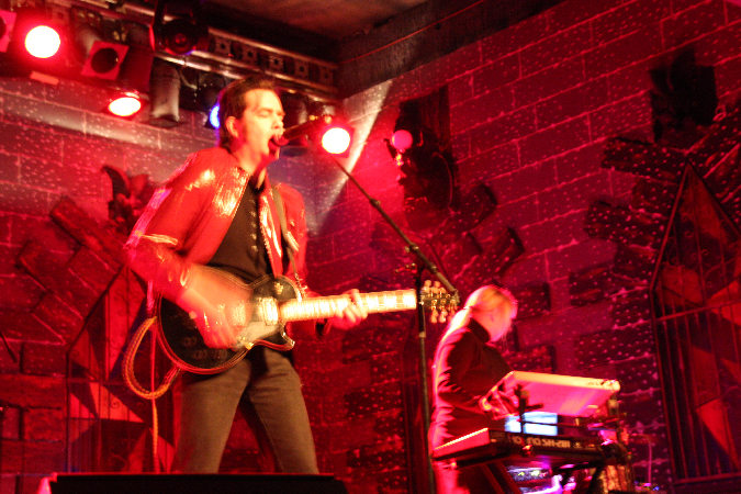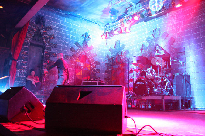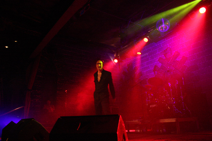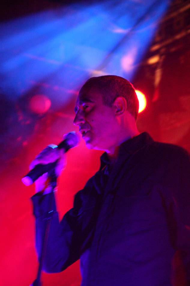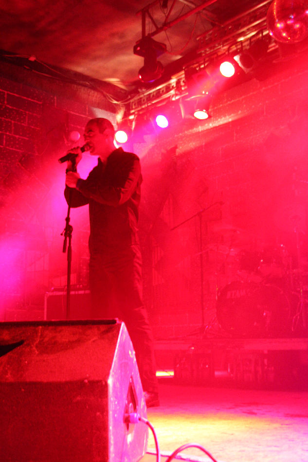 Die bei DAF nochmal aufgeräumter aussah, denn außer einem Schlagzeug und einem CD-Abspielgerät befand sich tatsächlich nichts mehr auf der recht hohen Bühne. Da das Pulp nicht nur von außen, sondern auch von innen wie ein mittelalterliches Schloss aufgemacht ist, wirkt das Gesamtbild seltsam: ein dürrer Gabi Delgado im Vordergrund, hinten nur die Drums und drumherum die altertümliche Optik, dazu erklang minimalistische Elektronik. Vor der Bühne tobte von der ersten Sekunde an der Mob im Pogo, denn DAF eröffneten ihren knapp 70 Minuten langen Set direkt mit ihrem Hit "Verschwende Deine Jugend". "Ich und die Wirklichkeit" folgte und zwei Songs später durften dann auch schon der Mussolini, der Adolf Hitler und der Jesus Christus getanzt werden, was sich das Publikum natürlich nicht zweimal sagen ließ. Nach "Ich will" stellte Gaby dann fest, dass seine Stimme schon so gut wie im Eimer war, was sich im Laufe des Abends natürlich nicht mehr zum Positiven veränderte. Allgemein machte Delgado nicht den fittesten Eindruck, wirkte aber offensichtlich sehr angetan von den Reaktionen aus dem Publikum und gab sich Mühe, Agilität zu zeigen. Homoerotisches bot er mit "Muskeln", bevor er sich erst einmal eine Flasche Wasser über den Kopf gießen musste.