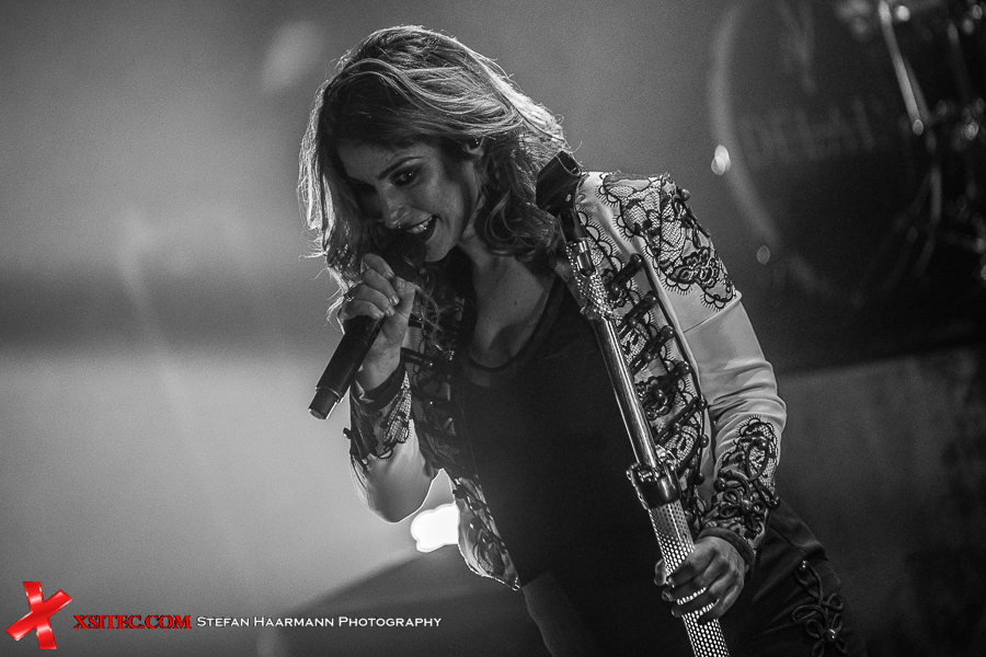 Charlotte Wessels, die sich während des Schlagzeug-Gitarren-Duells umgezogen hatte, begeistert mit starkem Gesang und treffsicheren Punches und Kicks, die die großen Ballons zum Ziel haben, die in der Zwischenzeit auf die Fans losgelassen wurden und immer wieder den Weg zurück zur Bühne finden.