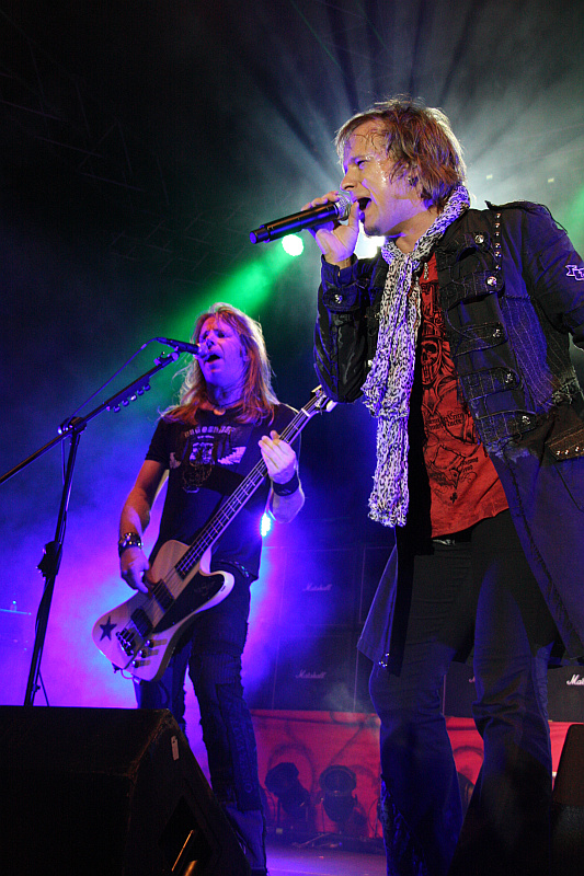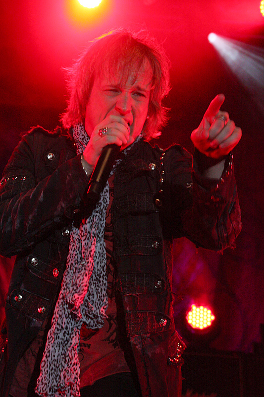 Für EDGUY ist es dann ein Leichtes, einen draufzusetzen, denn das Publikum frisst ihnen heute buchstäblich aus der Hand. Von der Bühne grinst einen der Joker vom Albumcover zwischen zwei dicken Amp-Wänden überdimensional entgegen, ansonsten verzichtet man weitestgehend auf optische Gimmicks und behält nur eine Überraschung in der Hinterhand. Im Internet konnte man vorher schon lesen, dass die Band eine extragroße Lichtshow auffahren würde und es ratsam sei, eine Sonnenbrille aufzusetzen. Das entpuppt sich jedoch als Ente, denn das Licht ist zwar schön bunt und abwechslungsreich, aber weder außergewöhnlich hell, noch sonst anders als bei anderen Konzerten. Die Band, allen voran Sänger Tobi beweist mit ihren Outfits wie immer, dass der Grat zwischen cool und albern ein schmaler ist. So ist Tobis Leopardenhalstuch ein bisschen zuviel des Guten, das dezente schwarz-in-schwarz-Leopardenmuster in Dirk Sauers Beinkleid dagegen eher stylish. Ansonsten wirken die Jungs immer noch wie die netten Schwiegersöhne von nebenan, die einen auf Rocker machen, daran wird sich in diesem Leben wohl auch nichts mehr ändern. Auch nicht an der Spielfreude und der Agilität, mit der wirklich alle über die Bühne fegen. Man sieht jedem einzelnen EDGUY an, wie viel Spaß er daran hat, da oben zu stehen und seine Songs zu spielen und zu singen. Dass sich so viel gute Laune dann auch auf das Publikum überträgt, verwundert nicht.