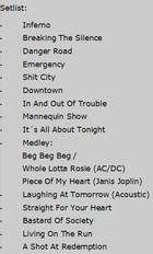 Zur Hälfte des Konzerts hat Erik Durst und lässt sich auf den Händen des Publikums zur Theke tragen. Dort angekommen, trinkt er auf dem Tresen stehend genüsslich ein Bier und schmettert ganz nebenbei den AC/DC Klassiker „Whole Lotta Rosie“ und „Piece Of My Heart“ der unvergessenen JANIS JOPLIN. Zurück auf der Bühne, schickt er seine Mitstreiter zum Frischmachen in die Maske, schnappt sich eine Westerngitarre und sorgt mit einer emotionalen Version von „Laughing At Tomorrow“ für ein weiteres Highlight an diesem Abend. In der Folge geht es wieder härter zur Sache. „Bastard Of Society“ beschließt das reguläre Set, aber H.E.A.T kommen natürlich nicht um eine Zugabe herum. Während „Living On The Run“ noch gesittet über die Bühne geht, bittet Erik Grönwall zum letzten Titel „A Shot At Redemption“ zahlreiche BesucherInnen auf die Bühne, die zusammen mit ihm und seiner famosen Band eine spontane Rock´n´Roll Party inszenieren. Danach ist Schluss, wohl auch deshalb, weil Setlisten, Plektrums, Drumsticks und weitere Souvenirs in dem Tumult den Besitzer gewechselt haben.