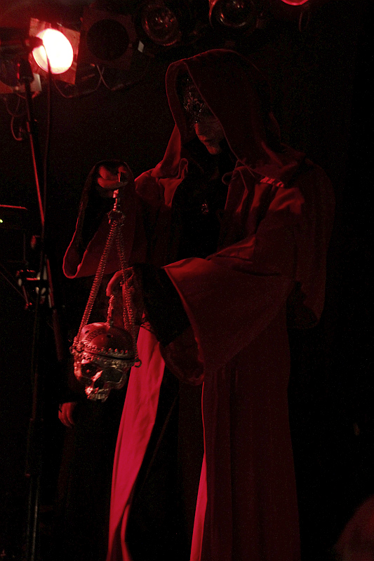 werden und ein Tisch für die rituellen Utensilien und den Kerzenständer bereit stehen muss, wird es verdammt eng. Eigentlich soll die Band auch um 22 Uhr loslegen, doch bis das Intro auch zum richtigen Zeitpunkt gestartet wird (einmal kommt es zu früh), vergehen weitere 20 Minuten. Ob die Verzögerung selbstverursacht ist, sei dahingestellt, im Publikum macht sich jedoch ein bisschen Ungeduld breit. Als es dann endlich losgeht, erscheinen die Musiker in lange Kapuzenkutten gehüllt (darunter eine Gitarristin, die sich unverschämterweise "Åskväder" nennt statt ordnungsgemäß Claudia, Margarete oder Chantalle... - LS) auf der Bühne und Sänger Kæffel sorgt mit mit einem Rauchschwenker in Totenkopfform für sakrale Atmosphäre. In blutrotes Licht getaucht wird orthodoxer Black Metal mit ungewöhnlichem Gesang und rituellen Handlungen dargeboten. Diese Theatralik ist sicher nicht jedermanns Sache, wer dafür jedoch empfänglich ist, hat an der kunstvoll aufgezogenen Show und guten Songs wie "Ardetha", "Blood For The Egregore" und dem abschließenden "The White Priestcraft" seine dunkle Freude. Trotzdem wäre eine größere Bühne für die Band angemessener gewesen. (ASZ)