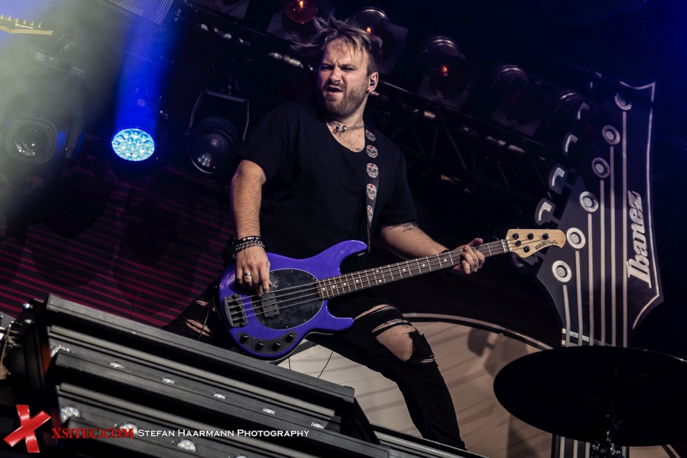 Nach „What Goes Up“ folgt mit „Scars“ der emotionalste Teil des Abends. Hannes Braun erzählt ohne Umschweife von seiner Lebenskrise, aus der ihn seine Band und das Schreiben neuer Musik heraus geholfen haben. Ein bewegender Moment. Danach legt die Band allerdings wieder einen gehörigen Gang zu: „YOKO ONO“, „Extasy“ und „I Will Be King“ (nur echt mit Zepter, purpurnem Mantel und silbernem Thron) stellen die Zeichen wieder auf Partymodus, der mit „DNA“ und „Six Feet Under“ weiter zelebriert wird. „You´re Not Alone“ und „Not The End Of The Road“ beenden das reguläre Set, doch KISSIN´ DYNAMITE kommen selbstverständlich nicht um eine Zugabe herum, die mit „Coming Home“ und „Flying Colours“ standesgemäß geliefert wird. Danach gibt es noch minutenlang lautstarke Ovationen des Kölner Publikums, das begeistert einen unvergesslichen Abend feiert.