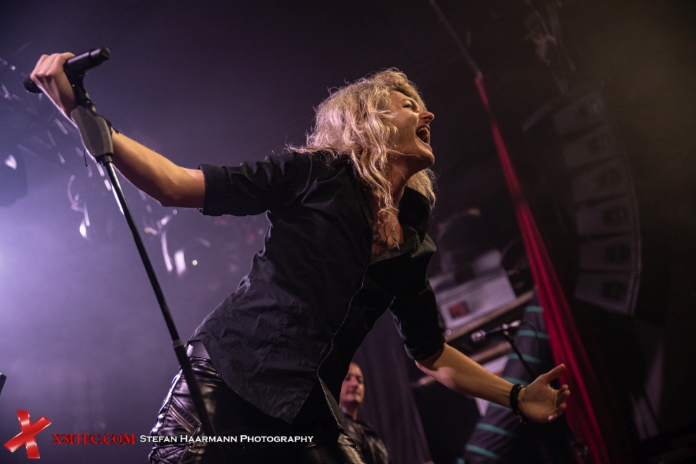 Eröffnet wird der Abend von den Newcomern LEAGUE OF DISTORTION, die sich während der Pandemie gegründet und Modern Metal auf die Fahne geschrieben haben. Eigentlich greift hier KISSIN´DYNAMITE Gitarrist Jim Müller in die Saiten, am heutigen Abend lässt er sich allerdings vertreten, um seine Kräfte für den Hauptact zu schonen. Frontlady Anna Brunner, die auch bei EXIT EDEN zusammen mit Amanda Somerville, Clémentine Delauney und Marina La Torraca aktiv ist, hat die Halle ab der ersten Sekunde auf ihrer Seite. Zum Finale mit „L.O.D.“ kommt dann auch Jim Müller zu einem Kurzeinsatz auf die Bühne. Ein durchweg gelungener Auftakt.