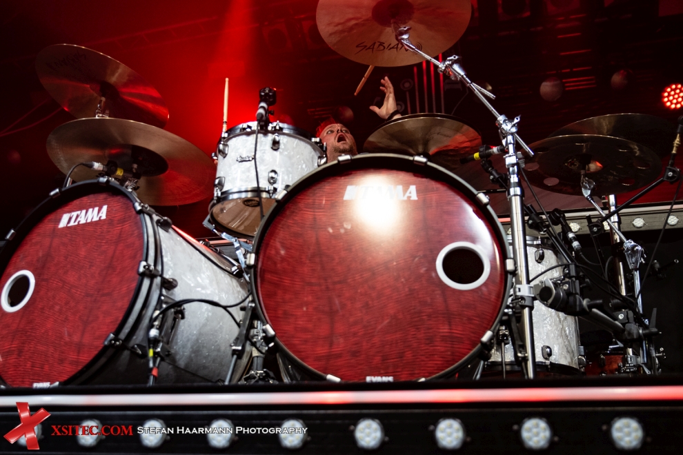 Nun aber ist es an der Zeit, die geballte Schwaben-Power loszulassen. Nachdem der Umbau der Bühne abgeschlossen ist, heißt es für KISSIN´ DYNAMITE: Rückkehr zur Normalität, wie Frontmann Hannes Braun unumwunden zugibt. Die vergangenen beiden Jahre waren für die Band eine nicht enden wollende Durststrecke, die jetzt endlich hinter ihnen liegt. Entsprechend furios gehen die Herren denn auch zu Werke: „No One Dies A Virgin“ vom aktuellen Album wird zunächst auf dem turmhohen Bühnenaufbau zelebriert, bevor sich dann Ande Braun (Gitarre), Jim Müller (Gitarre), Steffen Haile (Bass) die Stufen hinab begeben und nun hautnah vor ihren Fans agieren, das Ganze orchestriert von Dampfhammer Sebastian Berg, der wie aufgedreht auf die Felle eindrischt, wobei er des Öfteren auch gerne mal die Sticks in die Luft wirft und wieder auffängt.