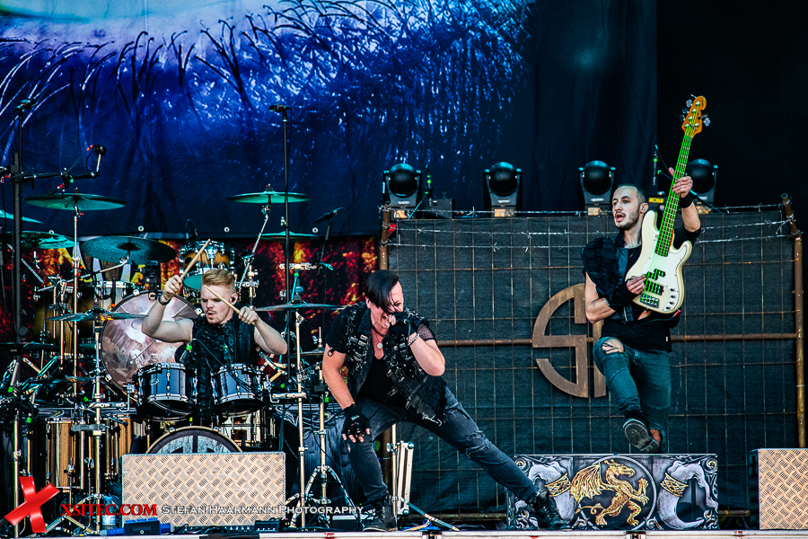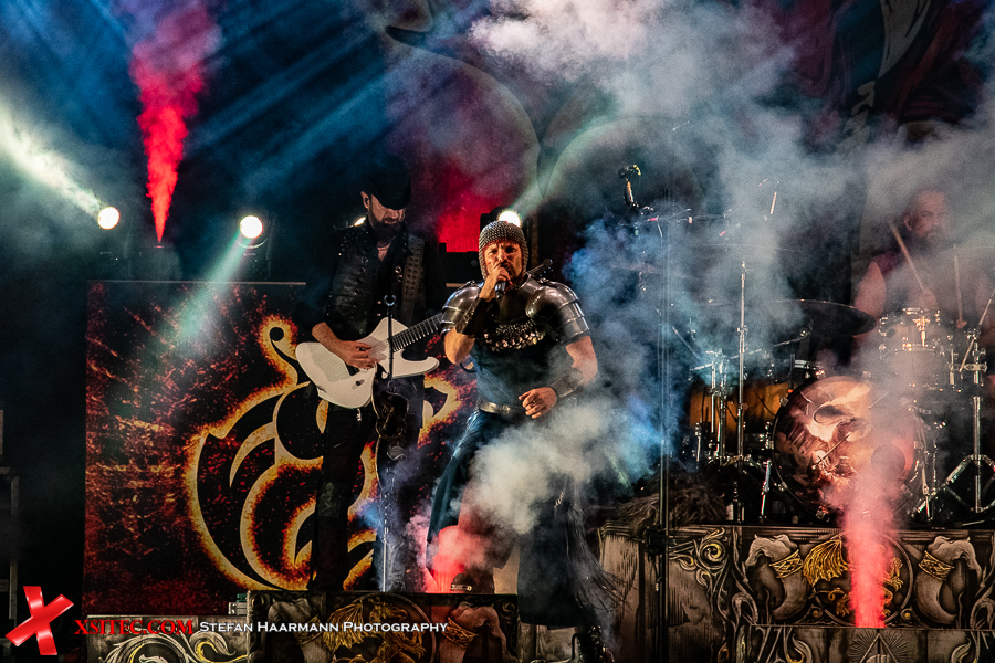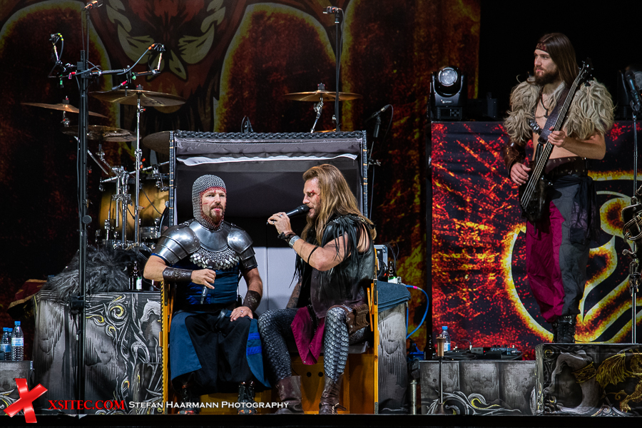 Dann aber ist es soweit und die selbsternannten Krieger des Mets machen sich daran, den Metnotstand ein weiteres Mal aktiv zu bekämpfen. Hauptmann Feuerschwanz und Prinz R. Hodenherz III springen wie wild über die Bühne, was wohl insbesondere durch die lange Konzertpause verständlich erscheint. „Metnotstand im Märchenland“, gefolgt von „Die Hörner hoch“ und „Wikinger Blut“ stellen die Weichen auf pure Ausgelassenheit und endlich wieder live zelebrierte Lebensfreude der Band aus Erlangen.