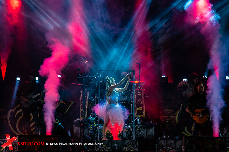 Für Tanzeinlagen und optische Highlights sorgt immer wieder die „Mieze“, die in wechselnden Kostümen den Rittern der Metrunde einheizt. „Schubsetanz“ vom 2018er Kracher „Methämmer“ wird vom Hauptmann und dem Prinzen selbstredend auch im Strandkorb abgefeiert, der extra zu diesem Zweck auf die Bühne gekarrt wird. „Prinzessin“, „Das Elfte Gebot“ und „Kampfzwerg“ heizen die Stimmung im weiten Rund weiter an, bevor mit „Ding“ die Coverversion des SEED Megahits ansteht, die in der Version der Feuerschwänze etwas metallischer, aber dennoch stimmig daherkommt. „Latte“ (Zitat Prinz R. Hodenherz III: „So richtig alte Scheiße“), „Operation Drachensturm“ sowie „Krieger des Mets“ beenden das reguläre Set, bevor FEUERSCHWANZ mit „Methämmer“, „Ketzerei“, „Malleus Maleficarum“ und „Unter dem Drachenbanner“ nochmals alle Register ihres Könnens ziehen