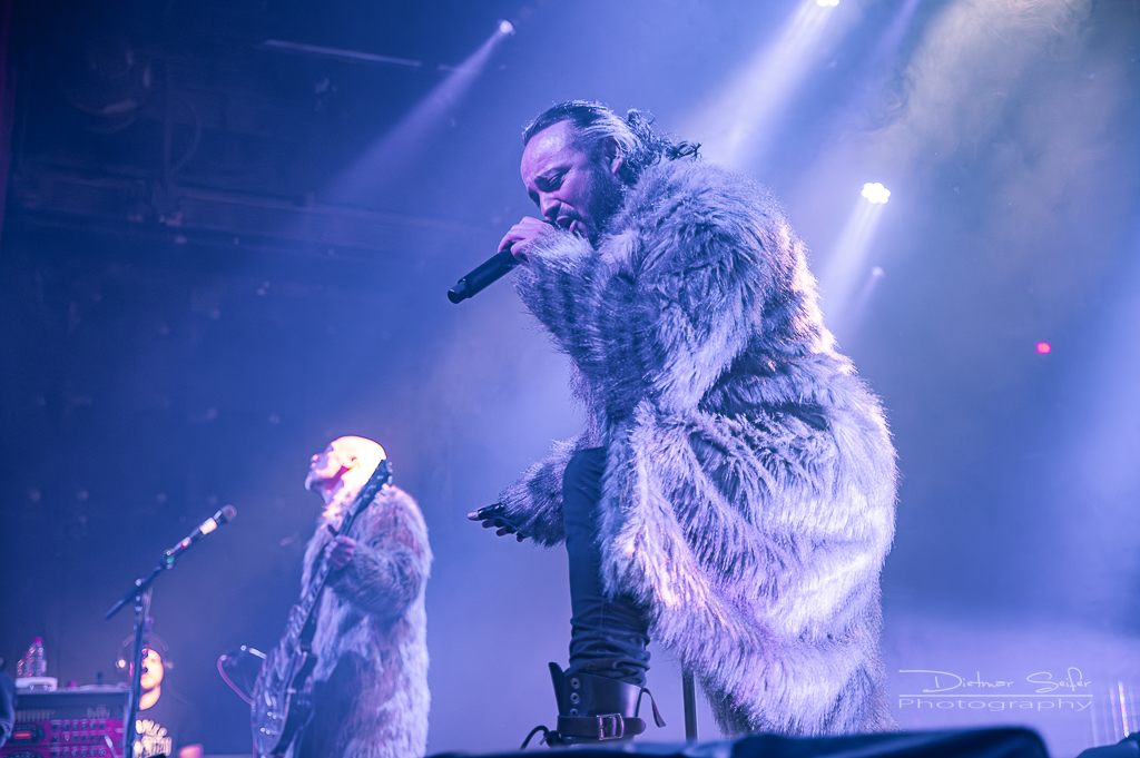 Nach einer kurzen Umbaupause startete dann nach dem Intro „Ein kleines bisschen Glück“ endlich der Mainact, auf den die Besucher schon seit fast zwei Stunden hinfieberten. In langen Pelzmänteln (hoffentlich unecht) eröffneten „Der Schulz“, CR4P und FLUX ein von den Fans lange erwartetes Konzertspektakel.