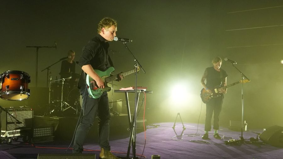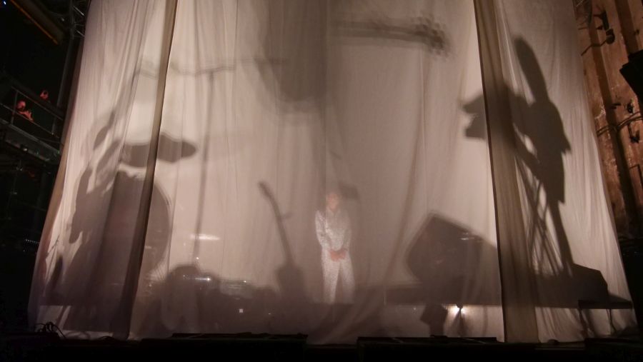 Bereits 2016 trat MAX RIEGER – seines Zeichens ein Drittel des Rock-Trios DIE NERVEN – sein atmosphärisches Depri-Poetik-Solo-Projekt ALL DIESE GEWALT los. Mit dem Commissioned Work im „Kesselhaus“ wurde nun sein aktuelles Album „Andere“ (auf dem auch ALBERTINE SARGES mitwirkte, die zuvor an gleicher Stelle bereits eine Show mit ihrer Band gespielt hatte) im Bandkontext auf ein vollkommen neues Level gehoben. Und zwar mit einem durchaus provokanten Konzept – denn die gesamte Bühne war mit von einer Deckenkonstruktion hängenden Stoffbahnen verhüllt, hinter denen die nur von hinten beleuchteten Musiker dann lediglich schemenhaft oder als vibrierende Schattenbilder zu sehen waren. Merkwürdigerweise erhöhte sich dadurch der hypnotische Charakter der zuweilen geradezu episch aufgetürmten Soundkaskaden und Drones, die die Musiker hinter ihren Schleiern mit manischer Intensität zelebrierten dann sogar noch – was zeigte, dass das Konzept richtig gedacht war.