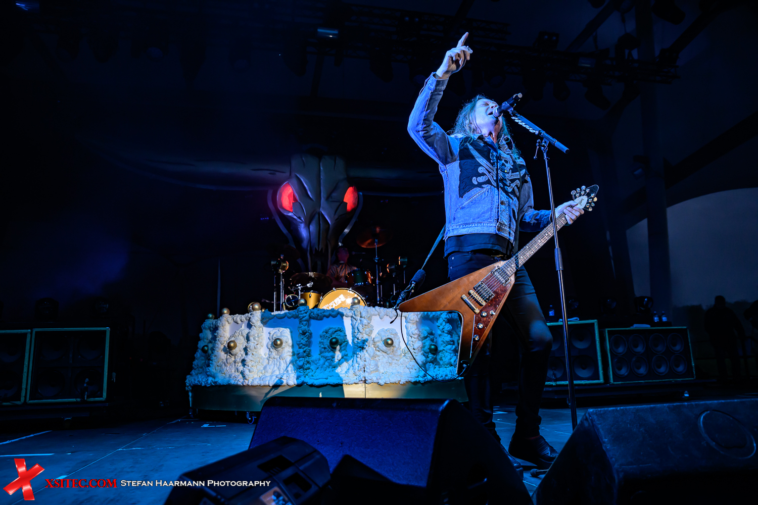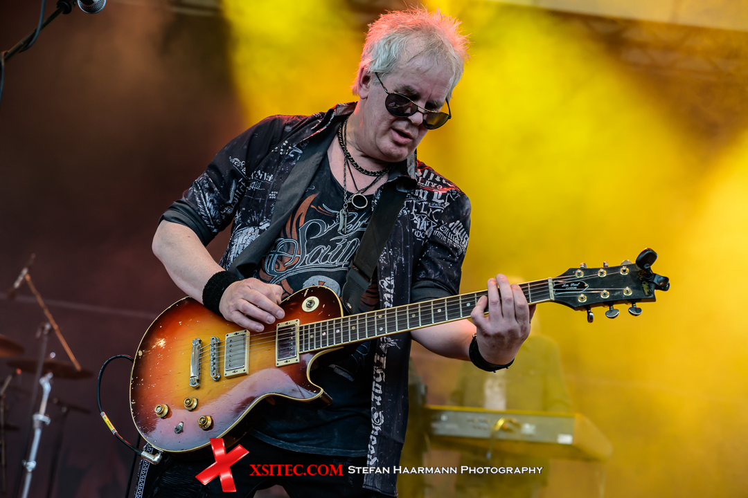 CHAPEL OF DISEASE werden anschließend als „beste Band des Tages“ anmoderiert, was den Jungs in der Anfangsphase des Konzerts sichtlich etwas Elan raubt, zu groß sind die Erwartungen der Fans im Amphitheater. Etwa zur Mitte des Konzerts zündet der Mix aus Metal, Prog und psychedelischen Elementen deutlich besser, während sich der Himmel über Gelsenkirchen in ein immer dunkler werdendes Grau wandelt, um sich kurz vor der Show der Altmeister DEMON in einem Wolkenbruch zu entladen. Ober-DEMON und einzig verbliebenes Gründungsmitglied Dave Hill kommt mit güldener Maske auf die Bühne, die er nach kurzer Zeit aber ablegt, um in der Folge einen Querschnitt durch die Hits aus 45 (!) Jahren Bandgeschichte zum Besten zu geben. „The Plague“, „Nowhere To Run“ oder „Don´t Break The Circle“ zeigen Hill in Top-Form, seine formidable Band trägt ein Übriges zum Gelingen der Show bei. Ein echtes Highlight des Finaltags.