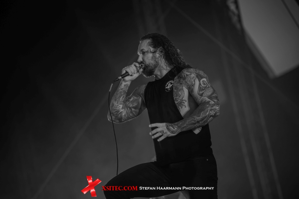 Weiter geht es mit den Metal-Core Heroen von AS I LAY DYING, die aufgrund einiger Probleme mit ihrer Fluggesellschaft ohne ihr Equipment und mit vierzig minütiger Verspätung in den Harz gekommen sind. An der Band scheiden sich spätestens seit der Verurteilung des Shouters Tim Lambesis die Geister, der seine Frau per gedungenem Killer das Lebenslicht ausknipsen wollte. Pech nur, dass er einen verdeckten Ermittler mit dem Mord beauftragte. Die Band formierte sich nach seiner Freilassung neu, die Mucke ist seit je her irgendwo zwischen Metalcore und Thrash zu verorten. Das Image als Christliche Band bezeichnete Lambesis vor Gericht als PR-Gag, der dazu dienen sollte, die Plattenverkäufe anzukurbeln. Wie gesagt: an AS I LAY DYING scheiden sich die Geister...