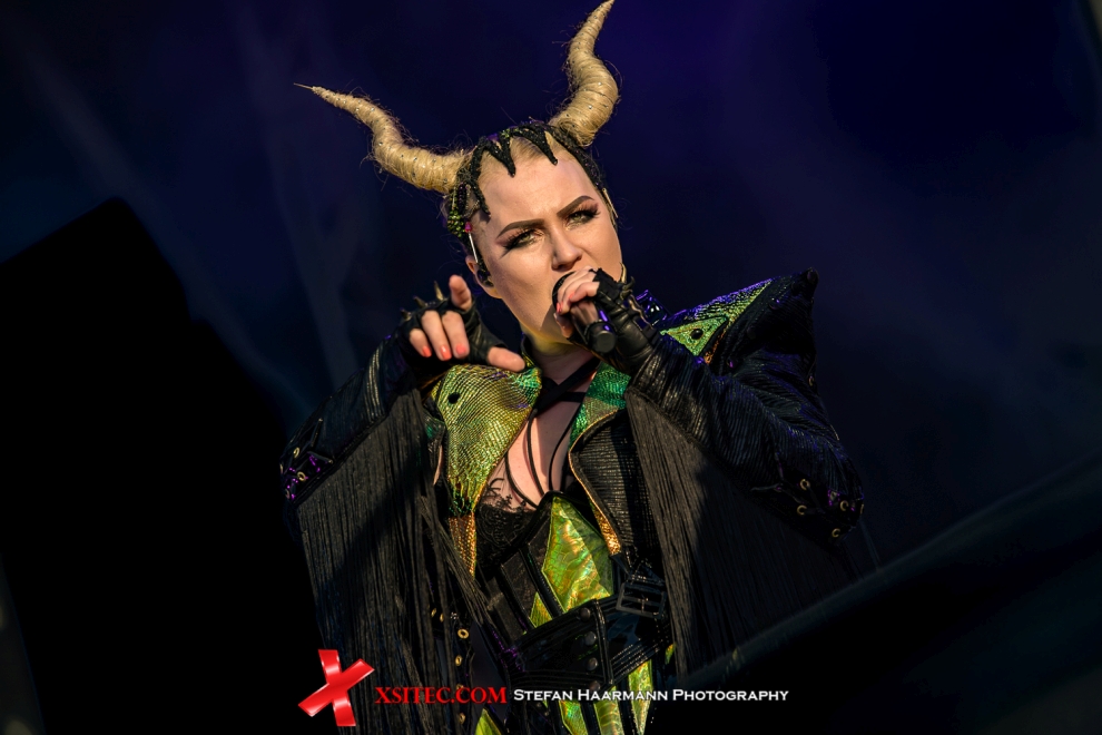 Der Ansturm der Crowd-Surfer verstärkt sich im Anschluss daran noch erheblich. ANGUS MCSIX, die neue Kapelle des ehemaligen GLORYHAMMER-Frontmanns Thomas Winkler, macht sofort mit Beginn des Sets deutlich, wo die Reise des neuen Ziehkindes von Sebastian „Seeb“ Levermann hingehen kann und vermutlich auch wird: in den Olymp der Drachentöter in güldener Rüstung. Neben Winkler und Levermann, letzterer inkognito als SEBULON unterwegs, agiert an der Stromgitarre Thalia Bellazecca, die neben gekonntem Riffing auch optisch einiges zu bieten hat. Die Show ist opulent, kurzweilig und voller Selbstironie der Akteure, die den Spaß an der Sache deutlich im Gesicht stehen haben und selbigen auf die Meute vor der Bühne transferieren können. Ein echtes Highlight. Und es geht Schlag auf Schlag weiter, denn nebenan entern BATTLE BEAST mit Frontlady NOORA LOUHIMO die Bühne. Die Finnen liefern ihren bewährten Party-Metal, der seit den Anfängen der Band deren Markenzeichen ist, auch wenn Anton Kabanen nach seinem Abgang mit BEAST IN BLACK in ähnlichen Gewässern fischt. „Eden“ und „King For A Day“ beenden einen grandiosen Auftritt, der gerne länger hätte dauern dürfen.