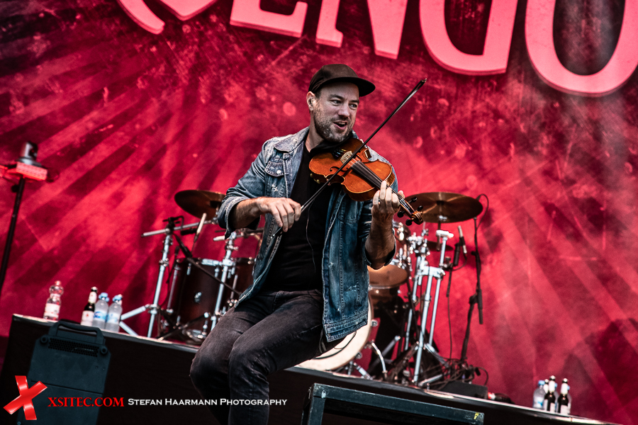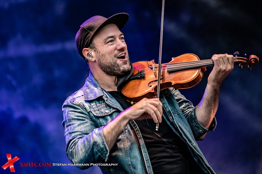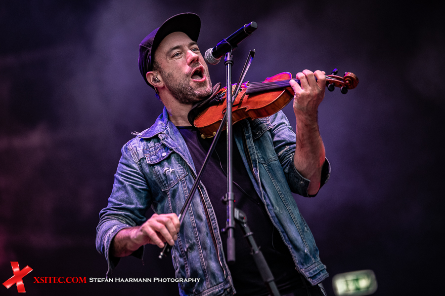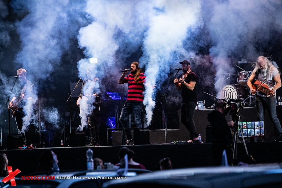 Zurück auf der Bühne gibt es mit „Verliebt in eine Insel“, die ultimative Liebeserklärung an Irland, während mit „Lichterloh“ ein weiterer neuer Song ansteht, der weder ein HÄMATOM noch ein WESTERNHAGEN Cover ist. Der Mittelteil gerät mit „Winterflut 1717“, „Teufelstanz“, „ Der Tag an den die Götter sich betranken“ und „Solange jemand Geige spielt“ zunächst düster, in der Folge aber wieder deutlich beschwingter. Das Transparent eines Fans erlangt bei letzterem Titel breite Aufmerksamkeit, denn der Spruch „solange Flo (Florian Janoske) die Geige spielt, bin ich unendlich frei“ schafft es auf die Videowall der Arena und sorgt für Szenenapplaus, zumal der so gefeierte Geiger auch heute wieder alles gibt.