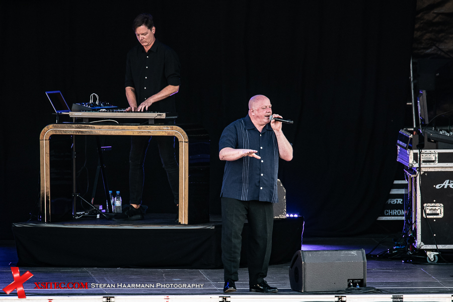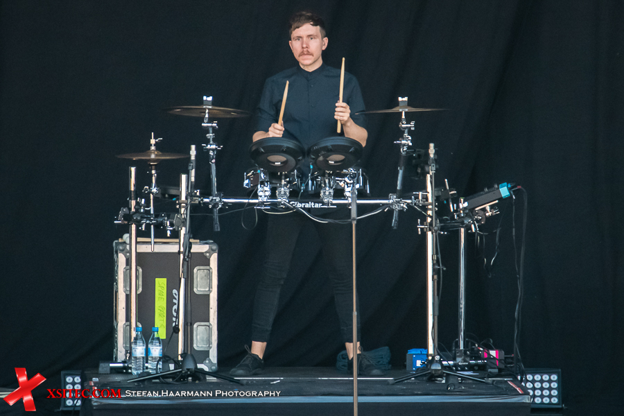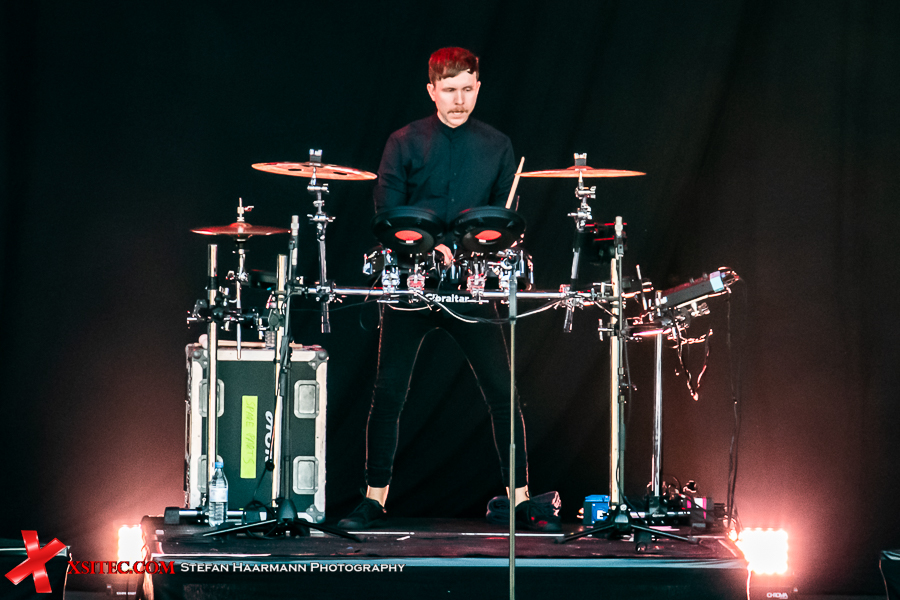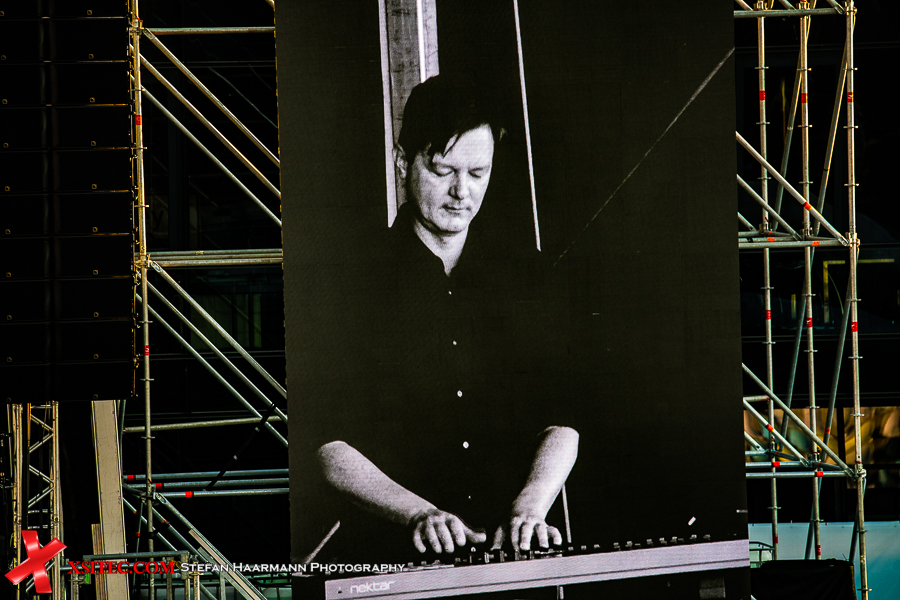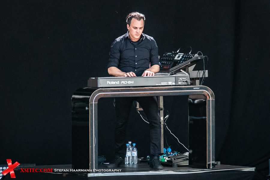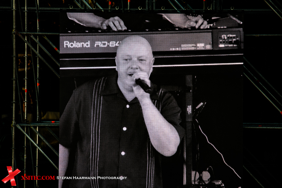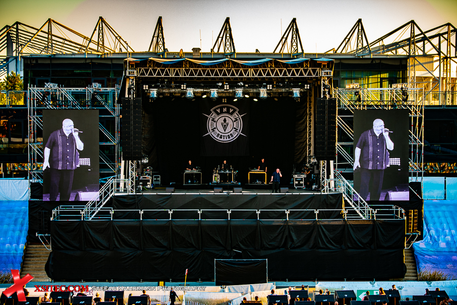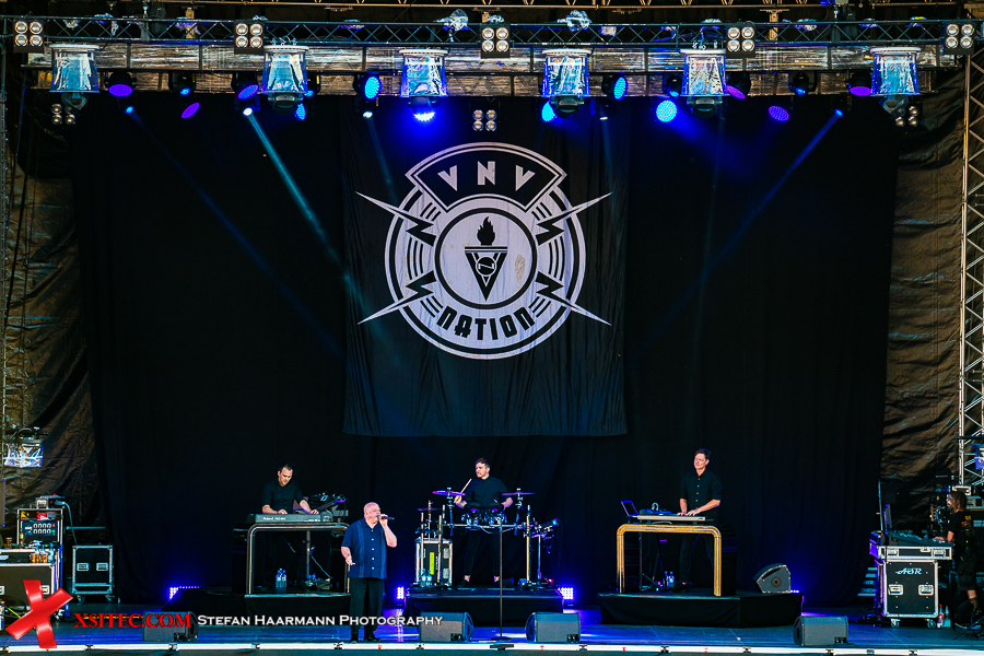 Gutgelaunt betreten VNV NATION die Turmhohe Bühne des SparkassenParks, turmhoch deshalb, damit von allen Plätzen aus die Sicht auf die Hauptakteure uneingeschränkt möglich ist. Ronan Harris & Co. starten mit „When Is The Future“, „Retaliate“ und „Tomorrow Never Comes“. Und während die Abendsonne in einem letzten Aufbäumen nochmals den Schweiß in Strömen fließen lässt, heizt die Band dem SparkassenPark von der Bühne noch zusätzlich ein. „Testament“, „Armour“, „Space & Time“, sowie das grandiose „Illusion“ sind weitere Highlights eines Konzerts, das im eigentlich mehr als 18.000 Zuschauern Platz bietenden SparkassenPark wieder so etwas wie Liveatmosphäre generiert.