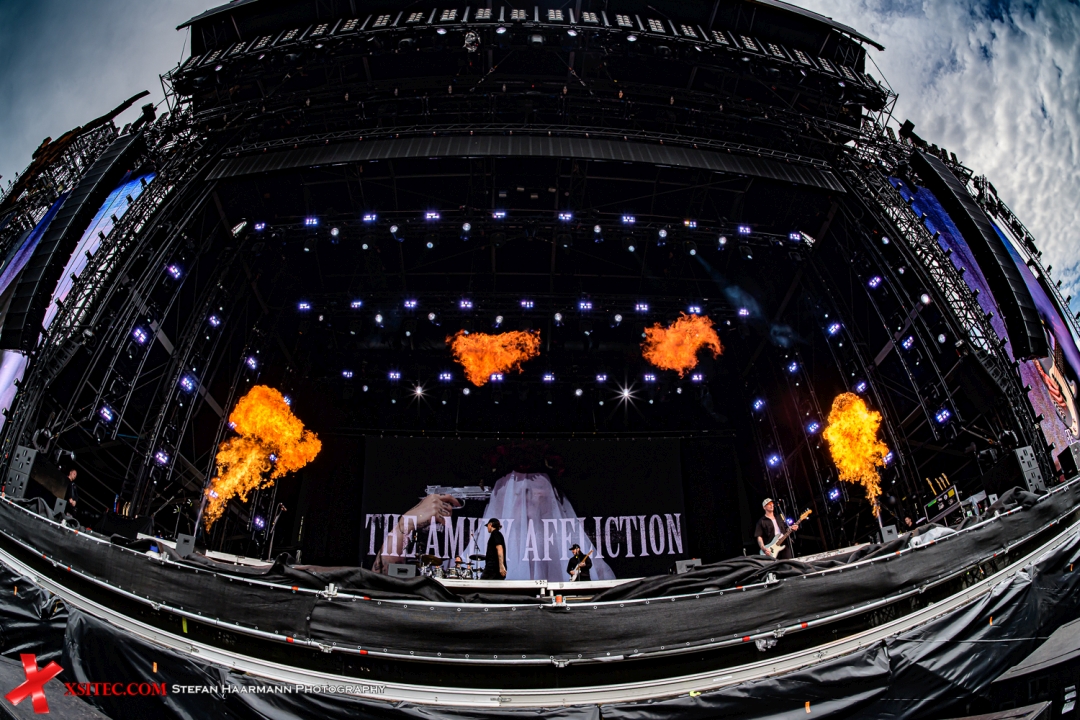 Danach gibt es auf der HARDER-Stage mit THE AMITY AFFLICTION Post Hardcore aus Down Under, der mit einigen Feuersalven um die gewissen visuellen Effekte bereichert wird. Joel Birch gefällt sich in der Rolle des Einpeitschers, der die Menge bestens im Griff hat und hier deutlich den Ton angibt. Nach dieser Lektion in Metalcore geht es nebenan weiter mit einem deutlich poppigerem Ansatz: