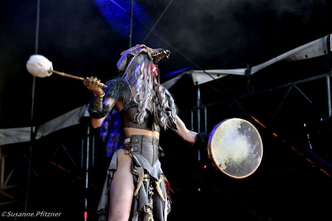 Zurück in den Wackinger-Bereich: EIHWAR bringen elektronische Beats, Tribal-Rhythmen und mittelalterliche Percussion zusammen. Ihre virtuosen Tanzeinlagen erinnern an schamanische Rituale. Die Zuschauer in Wikinger-Outfits, mit Trinkhörnern und Lederwams, tanzen wie in Trance – Metbecher klirren im Takt.