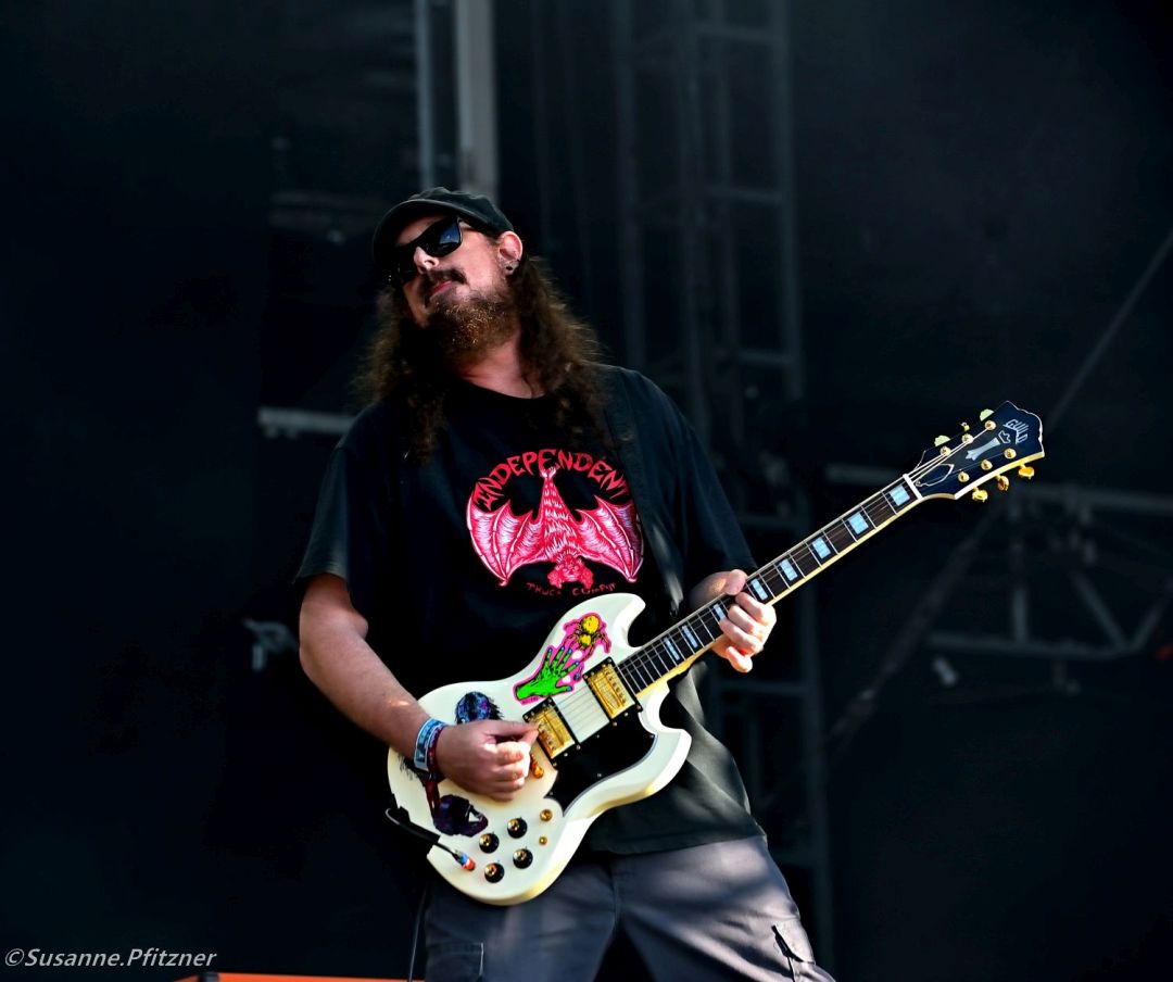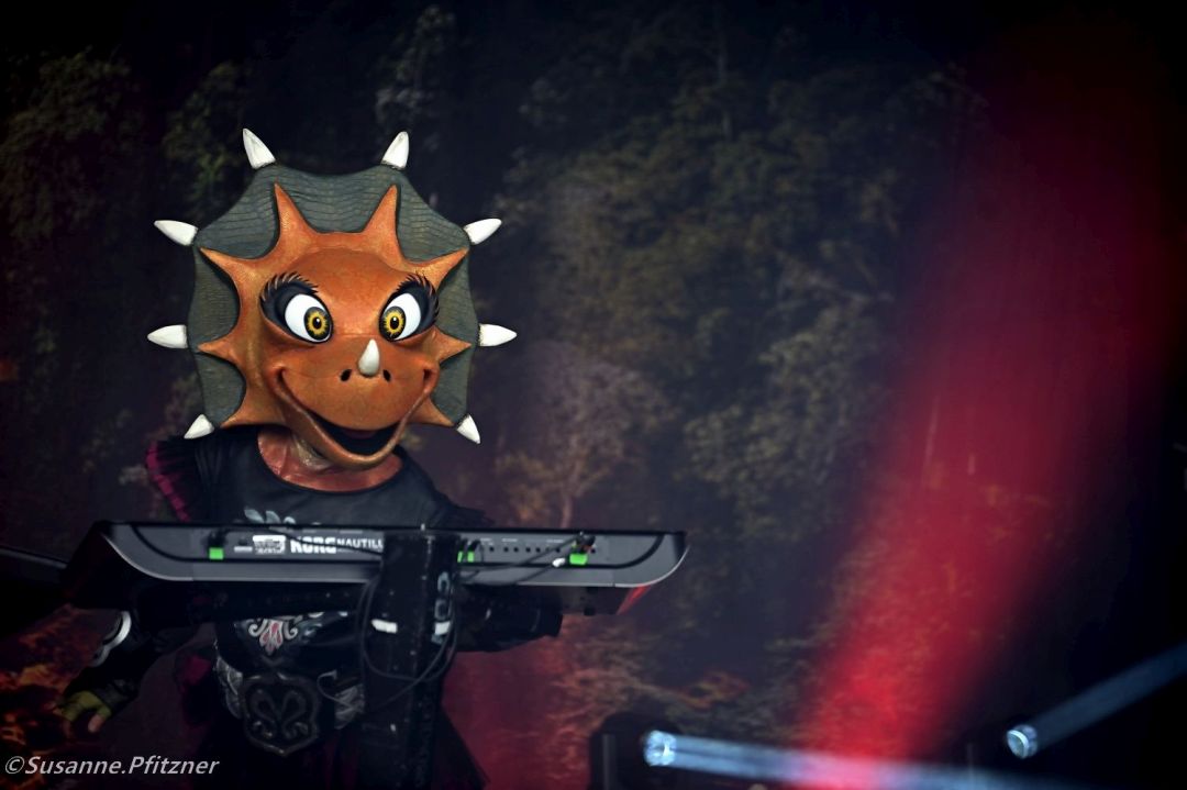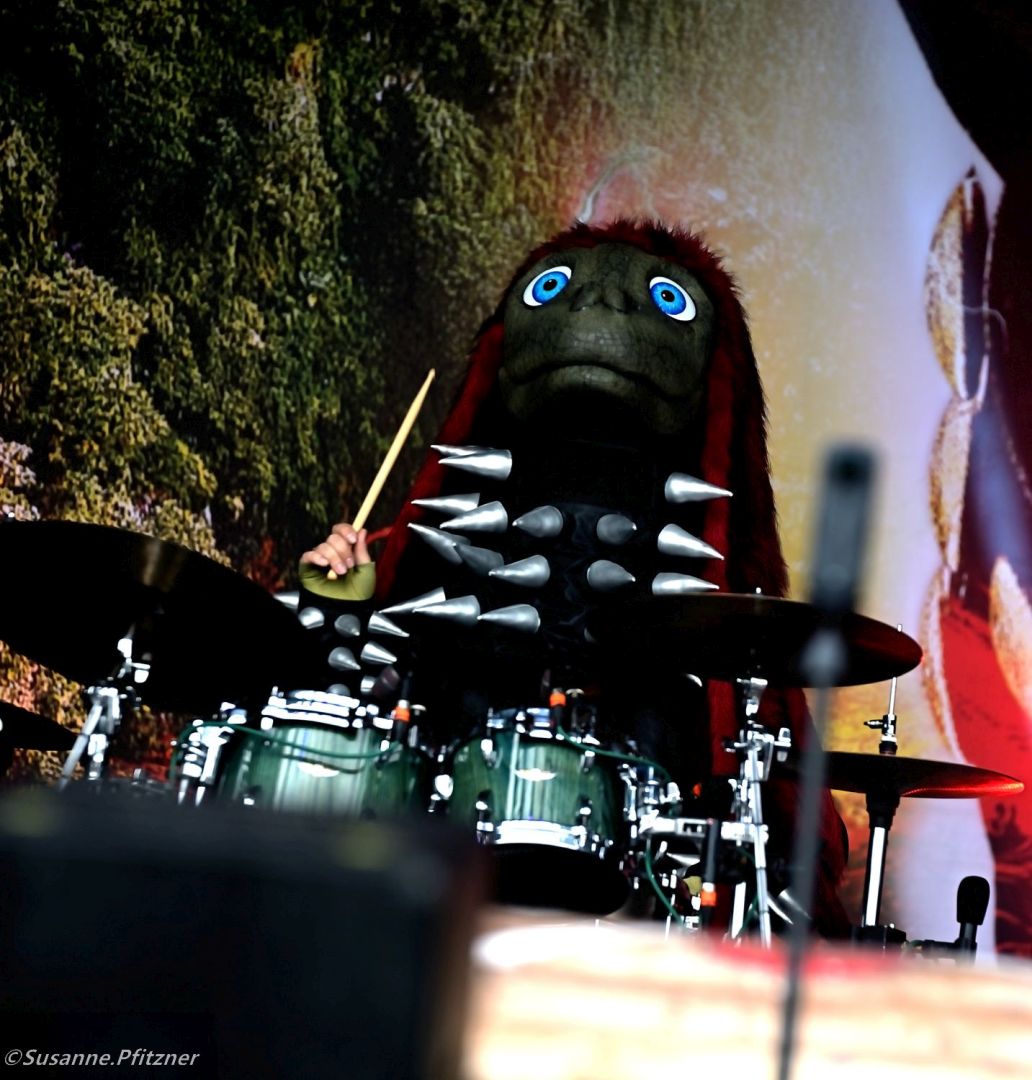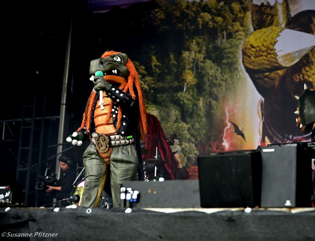 Erster Programmpunkt: HEAVY SAURUS auf der WET Stage. Die deutsche Spaß-Metalband für Kinder tritt in aufwendigen Dinosaurierkostümen auf und liefert kindgerechte Texte mit wuchtigen Metal-Riffs – ein Konzept, das nicht nur kleine Fans begeistert. Noch bevor die Band überhaupt auf der Bühne ist, skandiert die Menge im Chor „HEAVY SAURUS! HEAVY SAURUS!“ Zahlreiche Plüschdinos, Stofftiere und selbstgebastelte Sauriermasken werden in die Höhe gereckt. Als die ersten Töne erklingen, passiert das Unfassbare: ein Kindermoschpit. Ein völlig abgedrehter Festivalmoment._large.jpg)
