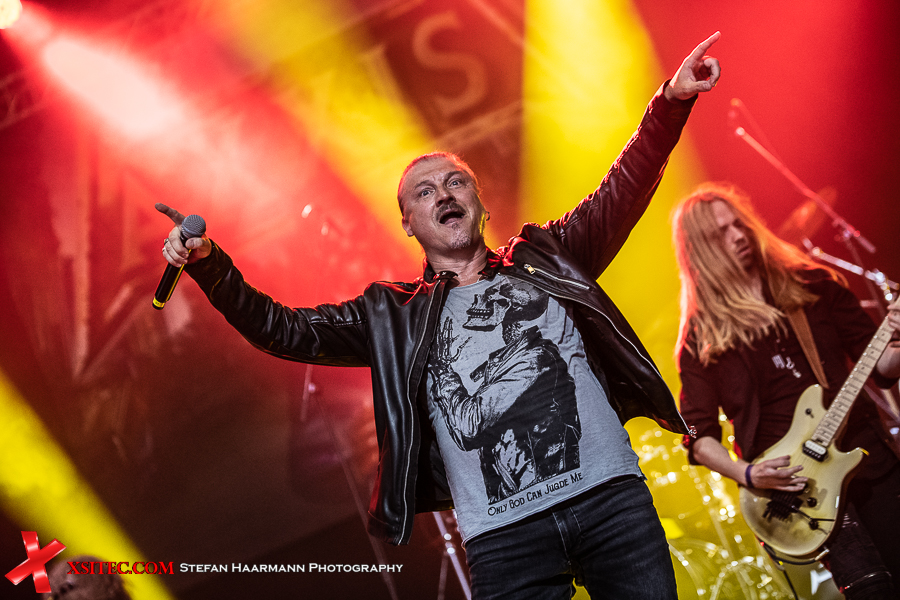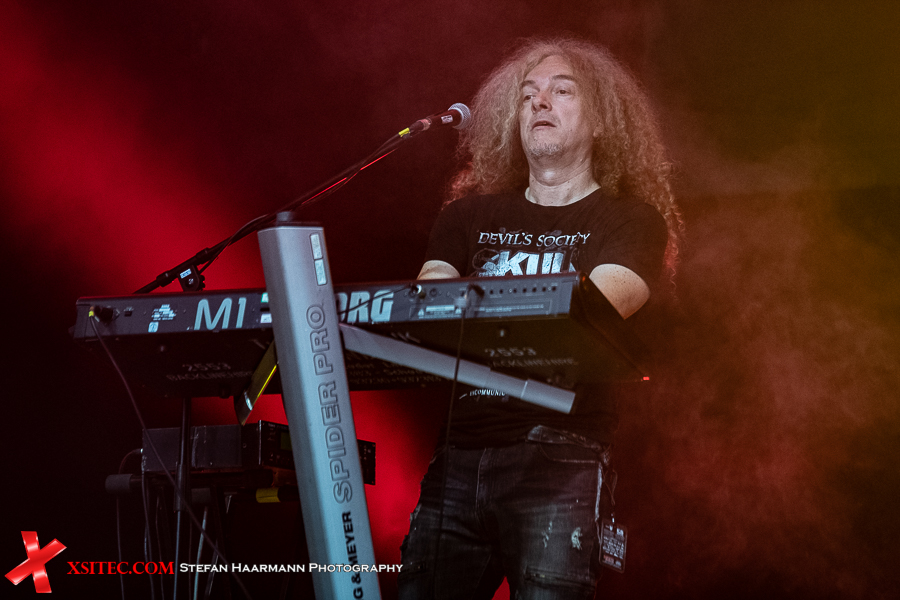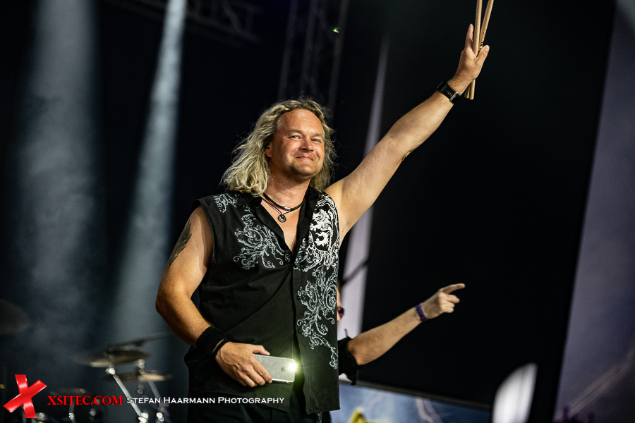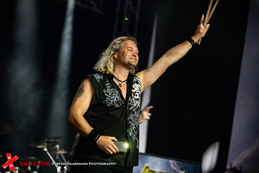 „Tales Of Glory Island“ mit epischem Keyboard-Intro des immer bereitwillig den Klangteppich ausbreitenden Harry Oellers rockt wieder deutlich härter, was für einige Circle-Pits im Zelt sorgt, von Double-Bass-Hexer Dirk Brand treibend in Szene gesetzt. Danach geht es mit „Touch The Rainbow“ zurück ins Jahr 1995, Off-Beat und abermals großer Chorus inklusive. Dass die Jungs immer noch tolle Musik schreiben, zeigt „Love Is Gonna Get You Killed“ von 2018: feinster Melodic Hard Rock, der direkt im Ohr bleibt, gleiches gilt für „Heavy Rain“ von 2015. Genialer Stoff.